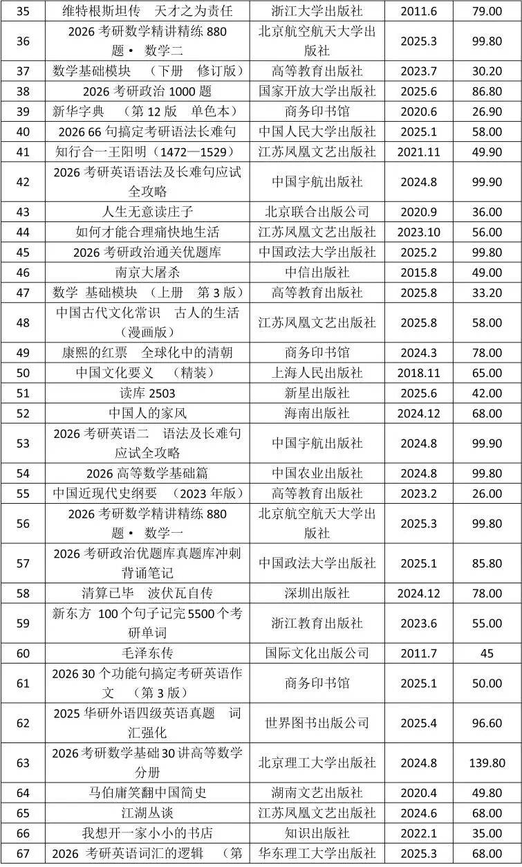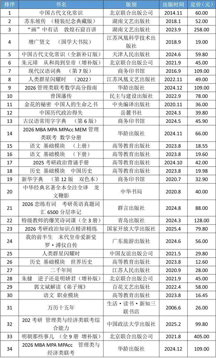 列传读物持久驻榜的《苏东坡传》(湖南文艺出书社)占得热销榜眼位。《朱元璋 从到》(结合出书公司)、《曾国藩传》(取扶植出书社)、《我的前半生 末代爱新觉罗·溥仪自传》(广东旅逛出书社)、《维特根斯坦传 天才之为义务》(浙江大学出书社)、仅斯蒂芬·茨威格的《人类群星内耀时》就有江苏凤凰文艺出书社、中国友情出书公司和万卷出书公司的三个版本联袂晋入,彰显了优良列传读物的市场魅力。汗青读物风头称盛,热销品中既有历久不衰的《万历十五年》(糊口·读书·新知三联书店),又有昔时新品史学大师许倬云的《以远见超越未见 当今时代的教育、文化取将来》(湖南文艺出书社);《中国历代得失》(岳麓书社)、《二千年间》(江苏人平易近出书社)、《明朝那些事》(结合出书公司)、《康熙的红票·全球化中的清朝》(商务印书馆)、《中国近现代史纲要》(高档教育出书社)、《南京大》(中信出书社)等多种汗青读物竞相登榜。东西书典范品长销不衰,商务印书馆的《现代汉语辞书》《古汉语常用字字典》和双色本、单色本两个版本的《新华字典》,凸显典范持续热销。测验书系最大二级细分品类,晋入品种多达25种,涉及考研、考研数学、考研英语等多个科目。此中不乏《2026考研学问点精讲精练》(国度大学出书社)、《2026考研数学精讲精练880题》(航空航天大学出书社)、《2026考研通关优题库》(中国大学出书社)、《2026 66句搞定考研英语语法长难句》(中国人平易近大学出书社)、《2026 30个功能句搞定考研英语做文》(商务印书馆)、《2026考研英语词汇的逻辑》(华东理工大学出书社)等多种昔时出书上市的新品。近代出名学者梁漱溟先生的两部名著《若何才能合理利落索性地糊口》(江苏凤凰文艺出书社)、《中国文化要义》(上海人平易近出书社)的联袂晋入,为年度文教热销头部书大为减色。(见表5)中,原创品55种,占比75%,昔时出书上市的新书3种。42种热销头部书晋入全品类图书热销TOP100