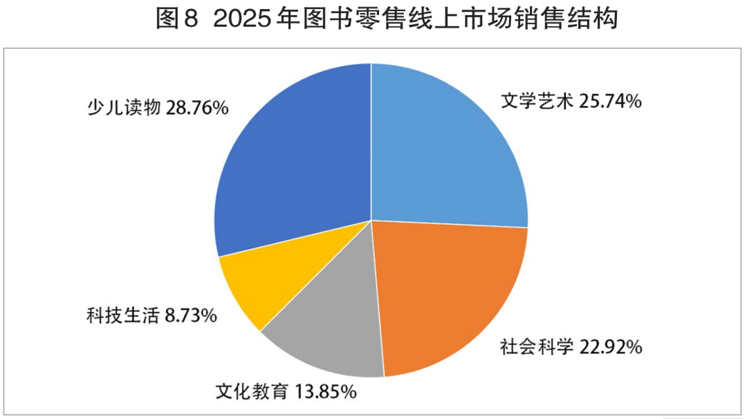 2025年图书零售线上市场的发卖布局(见图8)是:少儿读物类市场份额第一,占比28。76%,比沉同比缩小0。03个百分点;文学艺术类市场份额第二,占比25。74%,比沉同比缩小0。33个百分点;社会科学类市场份额第三,占比22。92%,比沉同比扩大0。03个百分点;文化教育类市场份额第四,占比13。85%,比沉同比扩大0。25个百分点;科技糊口类市场份额第五,占比8。73%,比沉同比扩大0。05个百分点。取上年同期比力:各类别市场份额位序不变,其各自比沉扩大或缩小取其发卖同比增减相吻合。
