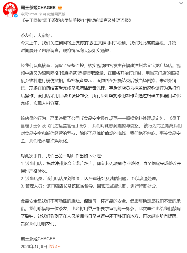 1月6日午后,霸王茶姬发布《关于网传“霸王茶姬伙计徒手操做”视频的查询拜访及处置传递》。传递称:经核查,调取了完整,核实视频内容发生正在福建漳州龙文宝龙广场店。视频中伙计为跟风收集“印度奶茶”热梗博取流量,期近将起头打烊时,用当天门店的报损烧毁物料进行仿照摆拍。